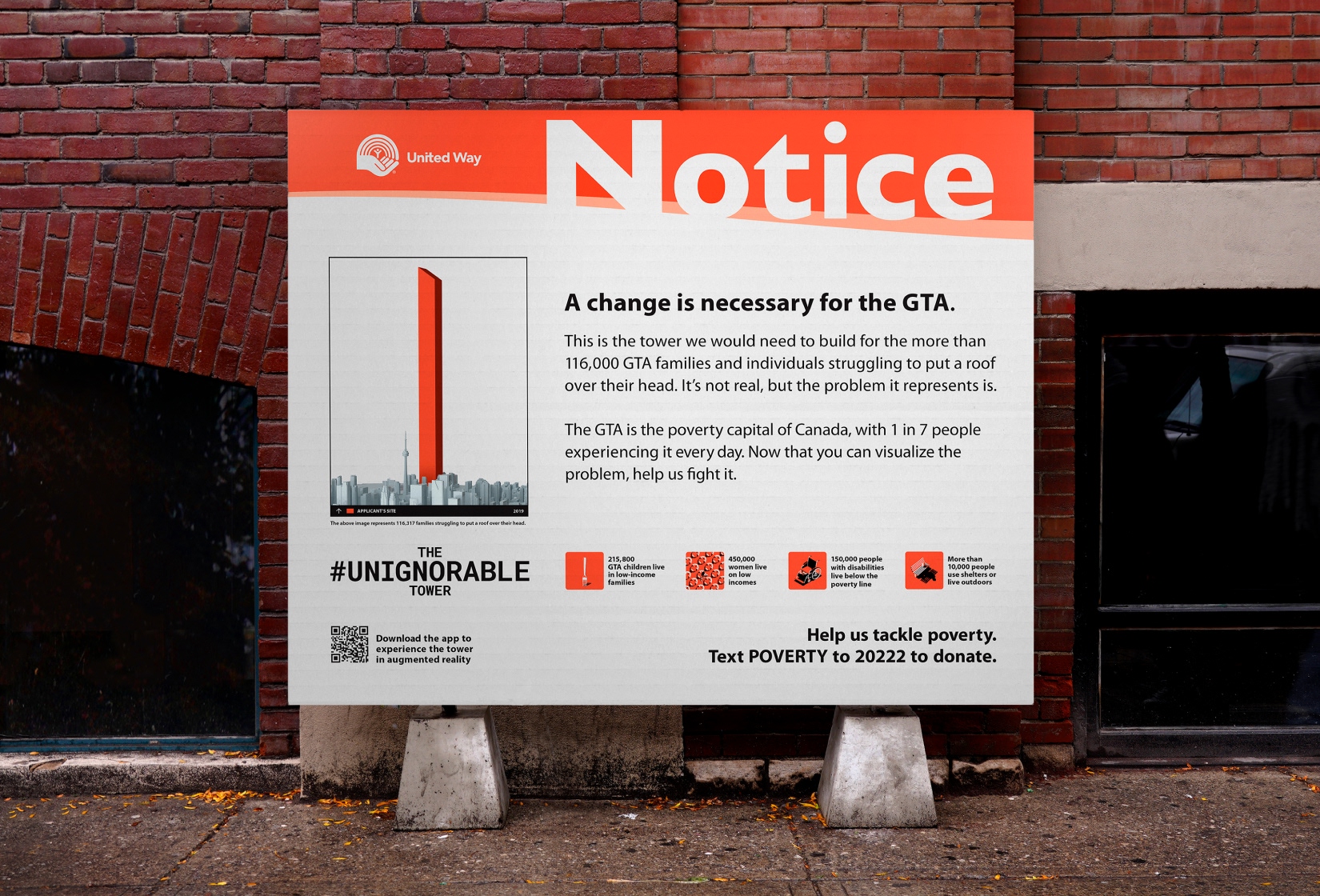 A campaign to raise awareness about the affordable housing crisis in Toronto, the Unignorable Tower was designed to visualize the number of affordable housing units urgently needed for those who are unhoused or still waiting for access to affordable housing.